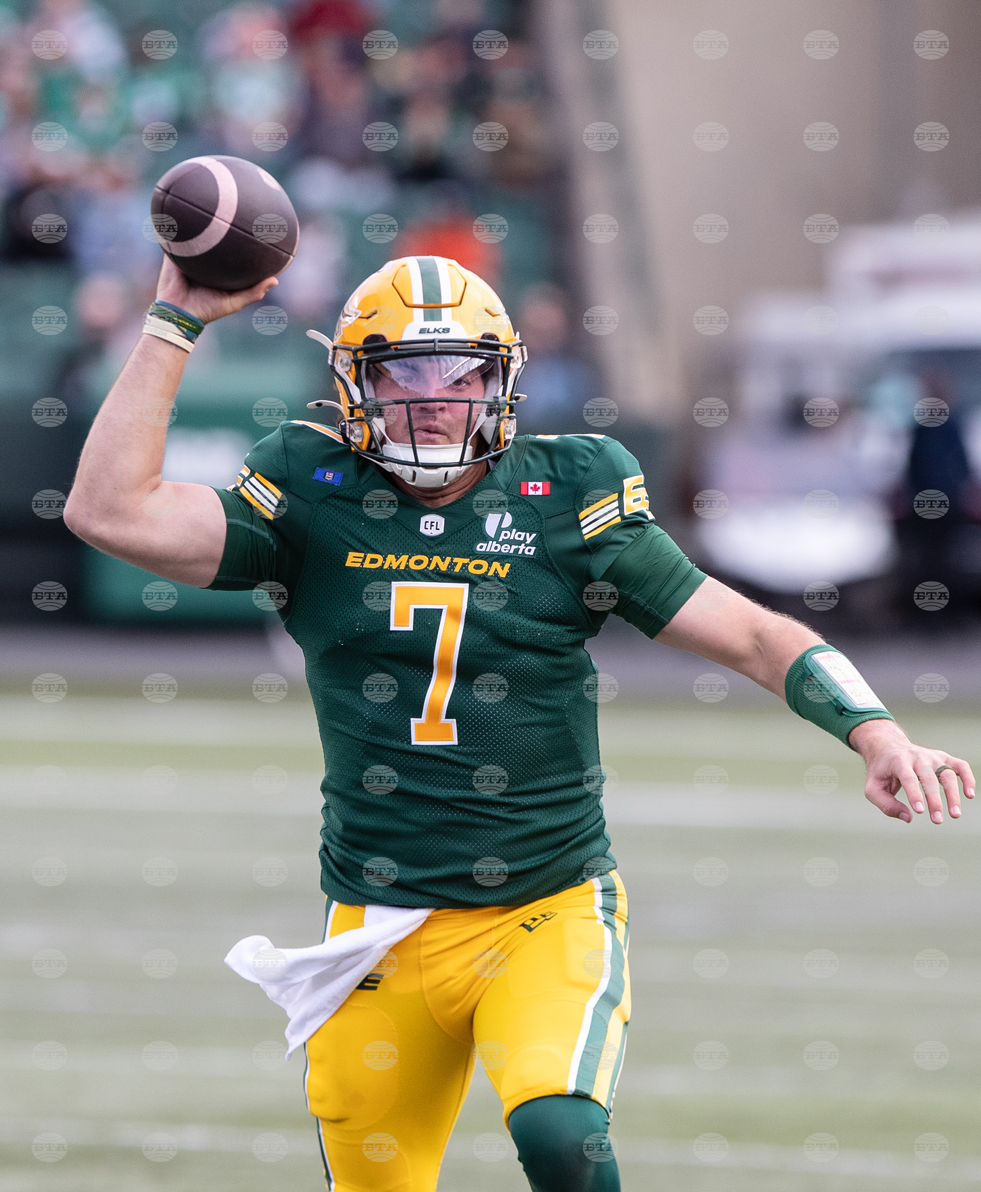 Saskatchewan Roughriders quarterback Trevor Harris (7) makes the throw against the Edmonton Elks during first half CFL action in Edmonton, on Saturday Sept. 27, 2025. (Jason Franson/The Canadian Press via AP)