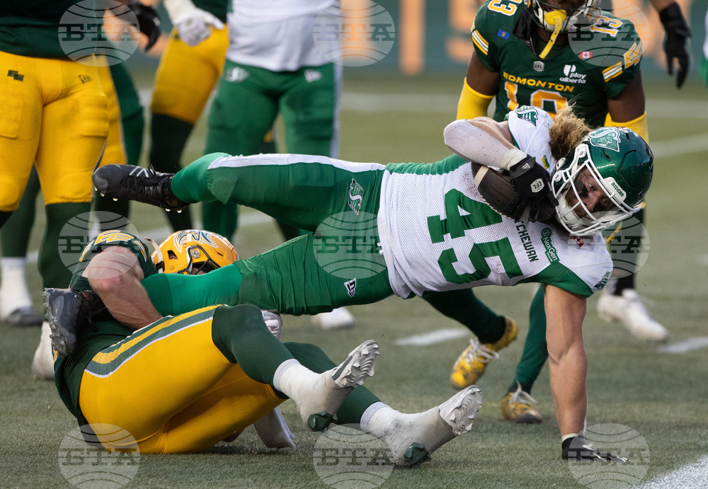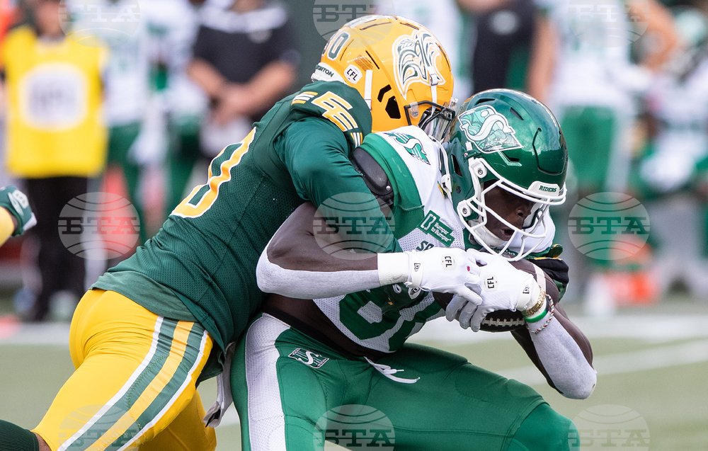 Saskatchewan Roughriders' A.J. Ouellette, right, is tackled by Edmonton Elks' Kobe Williams (0) during first half CFL action in Edmonton, on Saturday September 27, 2025. (Jason Franson/The Canadian Press via AP)