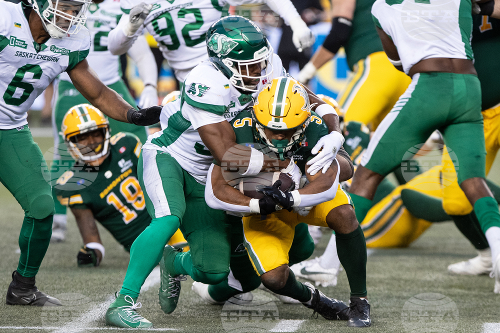 Saskatchewan Roughriders' Kosi Onyeka (31) tackles Edmonton Elks' Justin Rankin (5) during the second half of a CFL football game in Edmonton, Canada, Saturday, Sept. 27, 2025. (Jason Franson/The Canadian Press via AP)