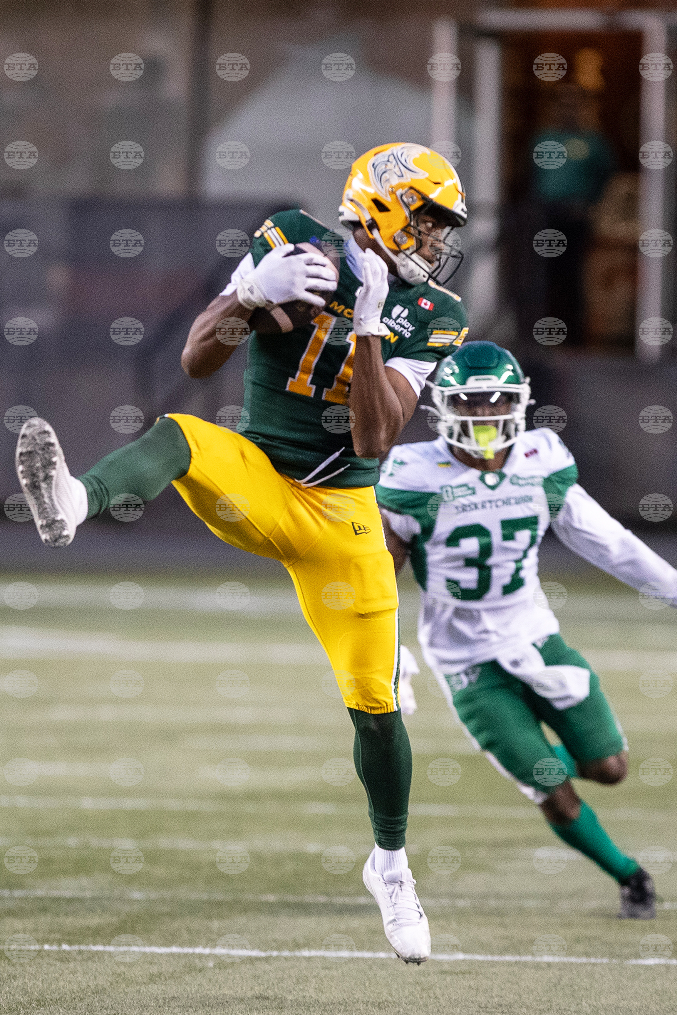 Saskatchewan Roughriders' Benjamin Sapp III (37) chases Edmonton Elks' Kaion Julien-Grant (11) as he makes the catch during the second half of a CFL football game in Edmonton, Canada, on Saturday, Sept. 27, 2025. (Jason Franson/The Canadian Press via AP)