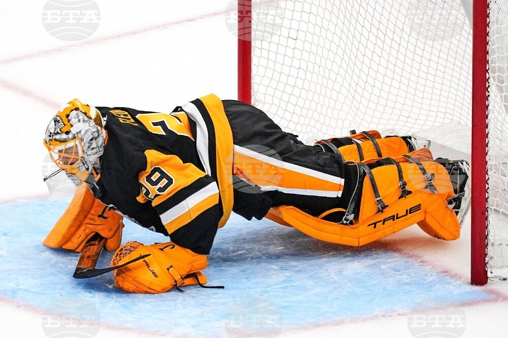 Pittsburgh Penguins goalie Marc-Andre Fleury stops a shot by Columbus Blue Jackets' Cole Sillinger (4) during a shootout in a pre-season NHL hockey game in Pittsburgh, Saturday, Sept. 27, 2025. (AP Photo/Gene J. Puskar)