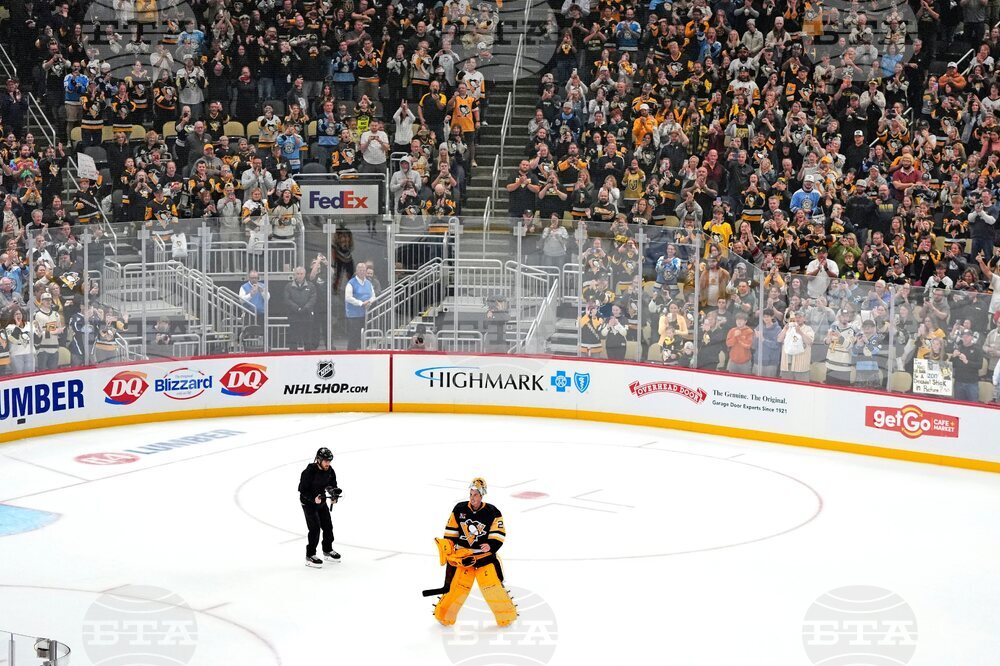 Pittsburgh Penguins goalie Marc-Andre Fleury takes a lap of PNC Paints Arena following a pre-season NHL hockey game against the Columbus Blue Jackets in Pittsburgh, Saturday, Sept. 27, 2025. (AP Photo/Gene J. Puskar)