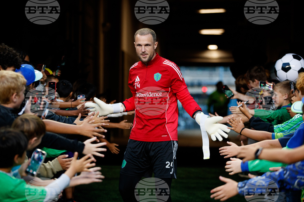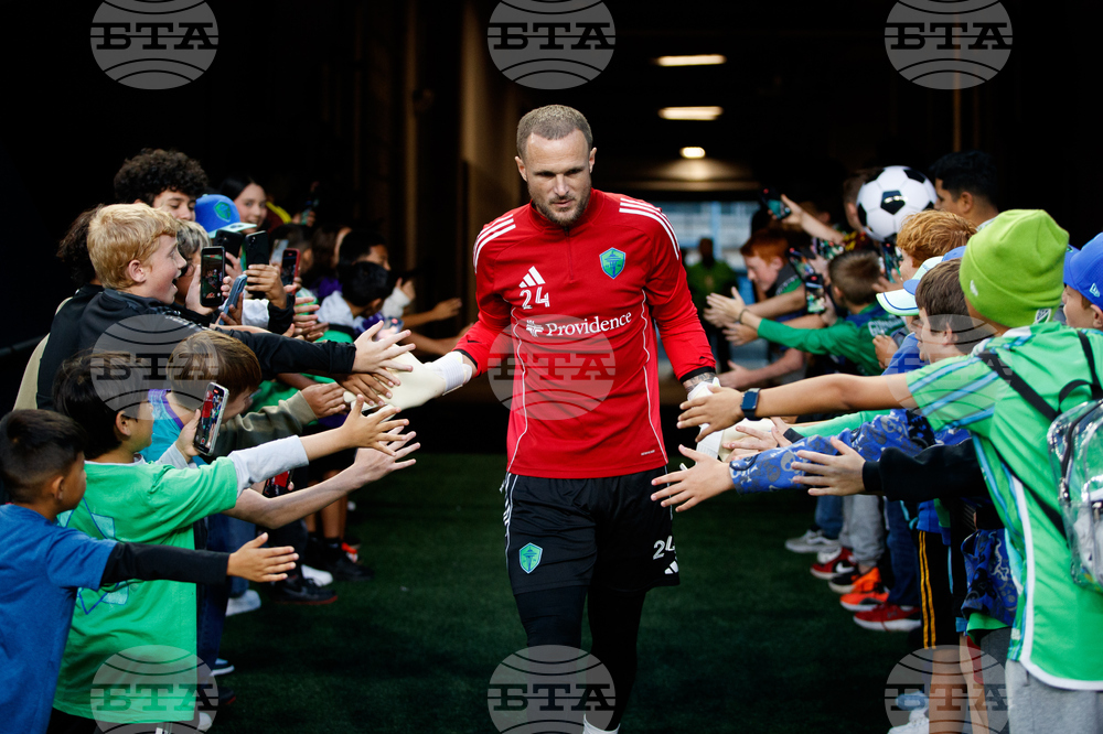 Seattle Sounders goalkeeper Stefan Frei enters the field before an MLS soccer match against Vancouver Whitecaps, Saturday, Sept. 27, 2025, in Seattle. (AP Photo/Kevin Ng)