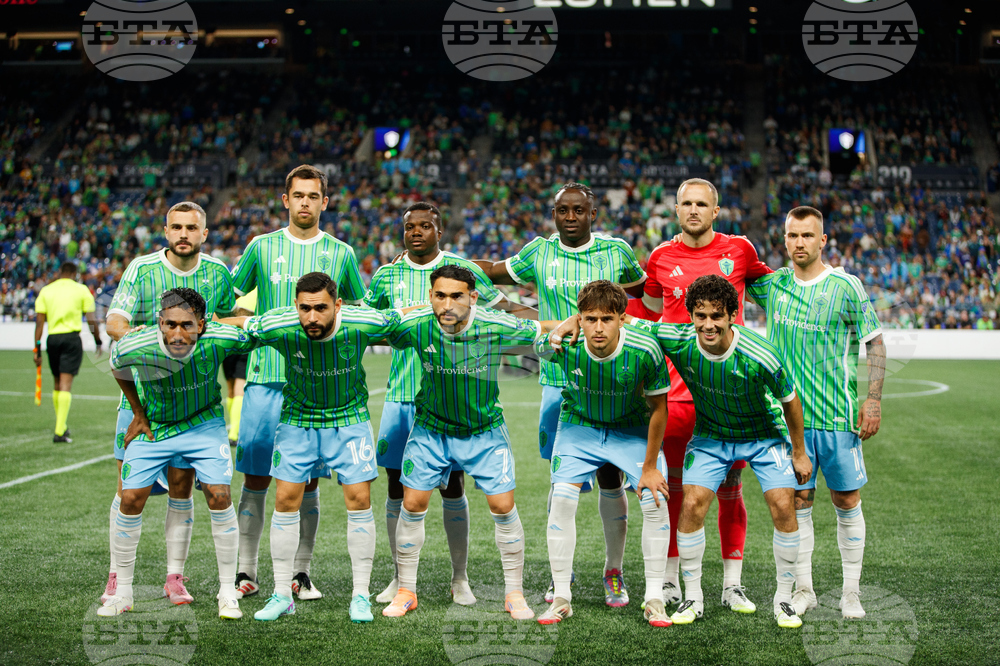 Seattle Sounders FC starting eleven pose for a photo before an MLS soccer match against Vancouver Whitecaps FC on Saturday, Sept. 27, 2025, in Seattle. (AP Photo/Kevin Ng)