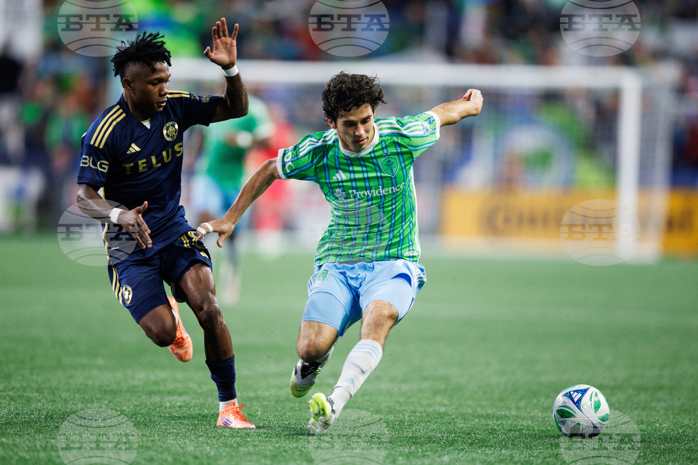 Vancouver Whitecaps FC defender Tate Johnson and Seattle Sounders FC forward Georgi Minoungou battle for the ball during the second half of an MLS soccer match Saturday, Sept. 27, 2025, in Seattle. (AP Photo/Kevin Ng)