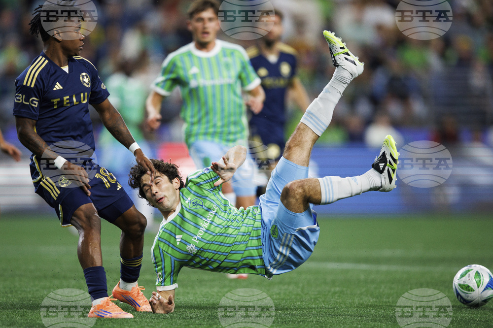 Seattle Sounders FC forward Paul Rothrock, center, attempts a bicycle kick during the first half of an MLS soccer match against Vancouver Whitecaps FC on Saturday, Sept. 27, 2025, in Seattle. (AP Photo/Kevin Ng)