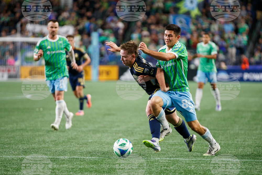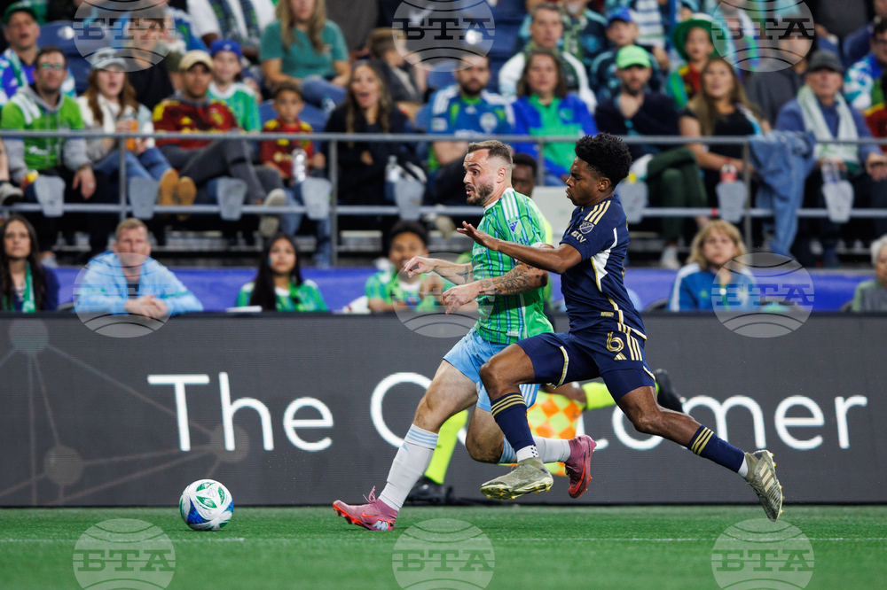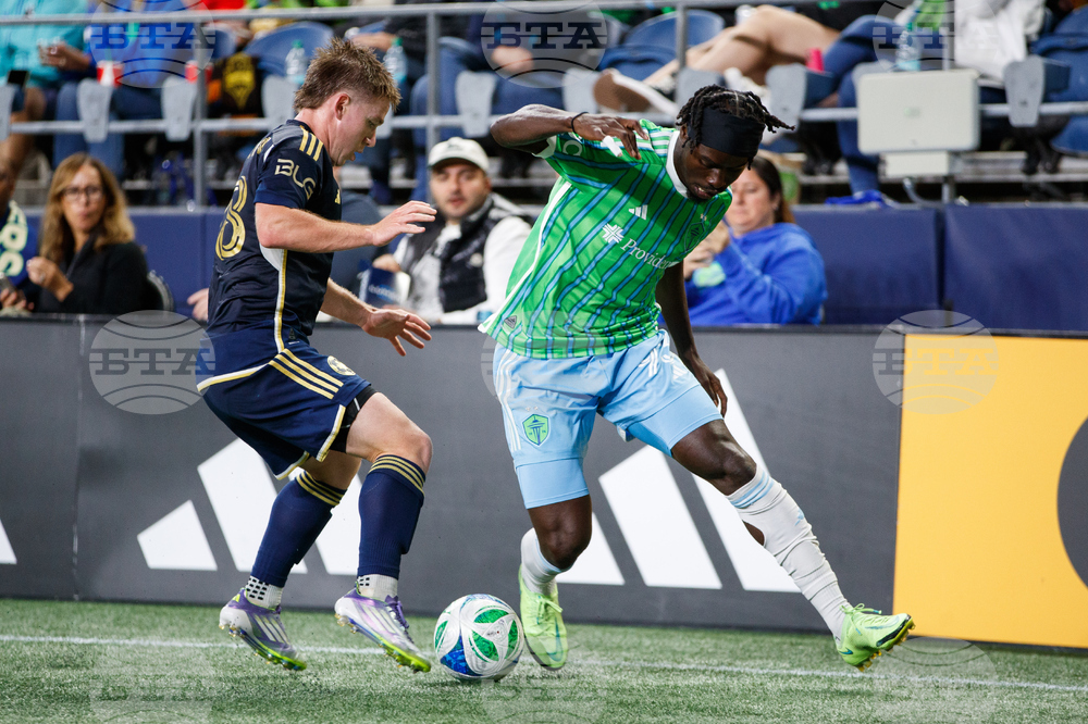 Seattle Sounders FC forward Paul Rothrock (14) runs after a loose ball during the first half of an MLS soccer match against Vancouver Whitecaps FC on Saturday, Sept. 27, 2025, in Seattle. (AP Photo/Kevin Ng)