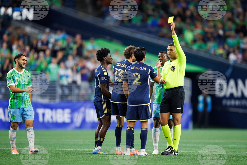 Vancouver Whitecaps FC defender Edier Ocampo, midfielder Thomas Müller and defender Mathias Laborda, from left to right, react to a yellow card during the first half of an MLS soccer match against Seattle Sounders FC on Saturday, Sept. 27, 2025, in Seattle. (AP Photo/Kevin Ng)