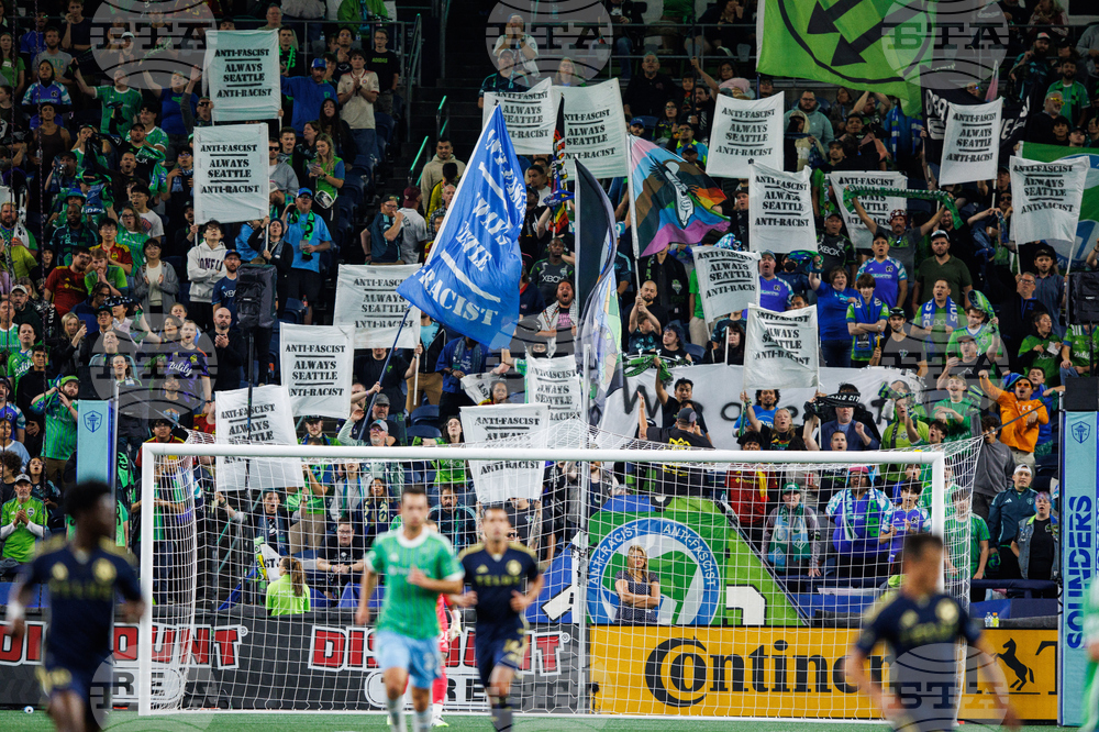 Seattle Sounders FC fans hold up signs saying "anti-facist, always Seattle, anti-racist" during the first half of an MLS soccer match against Vancouver Whitecaps FC on Saturday, Sept. 27, 2025, in Seattle. (AP Photo/Kevin Ng)