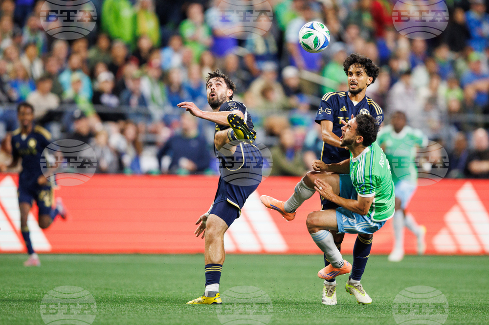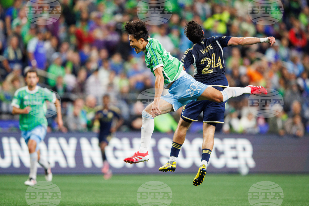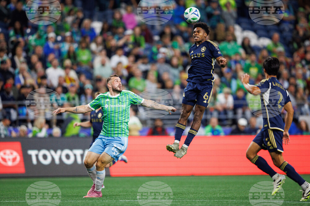 Vancouver Whitecaps FC midfielder Ralph Priso heads the ball past Seattle Sounders FC forward Jordan Morris during the first half of an MLS soccer match Saturday, Sept. 27, 2025, in Seattle. (AP Photo/Kevin Ng)