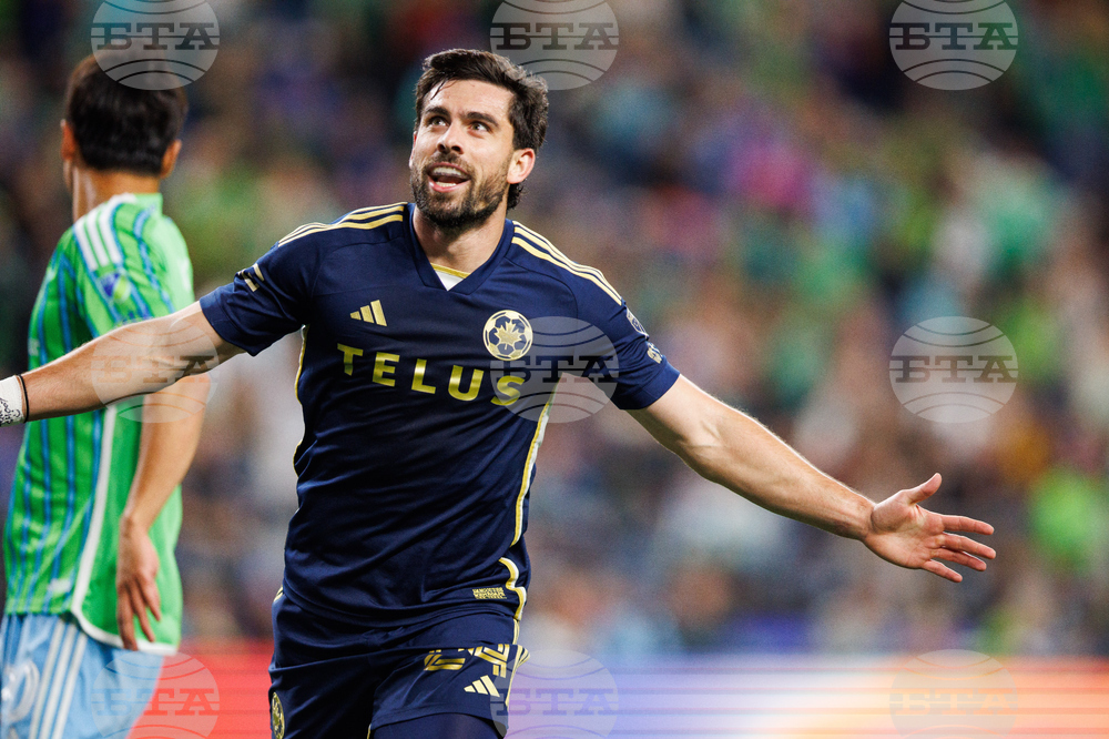 Vancouver Whitecaps FC forward Brian White celebrates scoring a goal during the second half of an MLS soccer match against Seattle Sounders FC on Saturday, Sept. 27, 2025, in Seattle. (AP Photo/Kevin Ng)