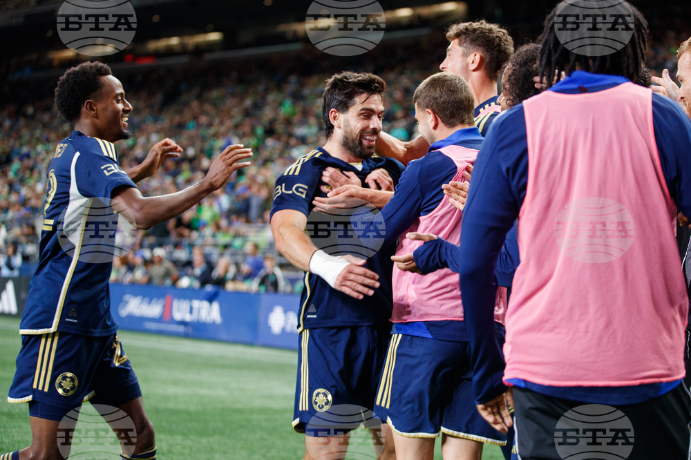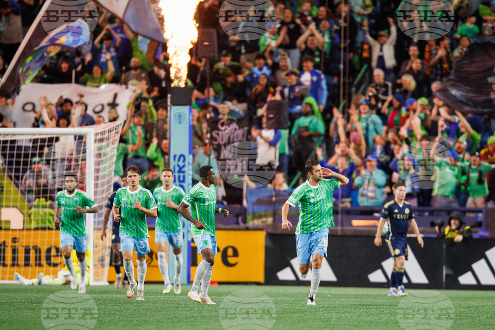 Seattle Sounders forward Paul Rothrock (14) enters the field before an MLS soccer match against Vancouver Whitecaps, Saturday, Sept. 27, 2025, in Seattle. (AP Photo/Kevin Ng)