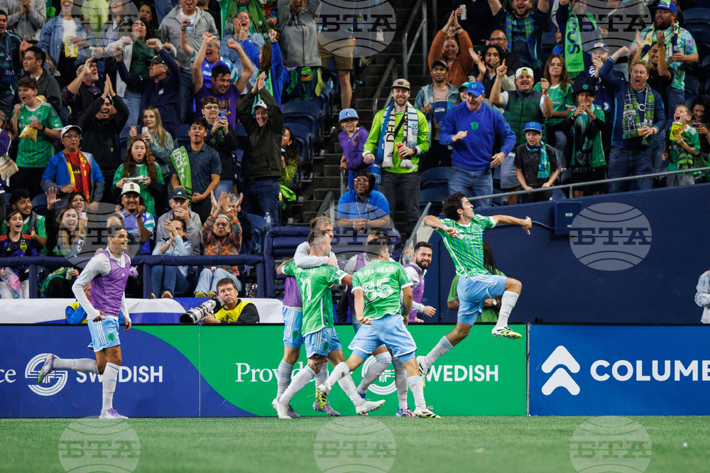 Seattle Sounders FC forward Paul Rothrock celebrates scoring a goal during the second half of an MLS soccer match against Vancouver Whitecaps FC on Saturday, Sept. 27, 2025, in Seattle. (AP Photo/Kevin Ng)
