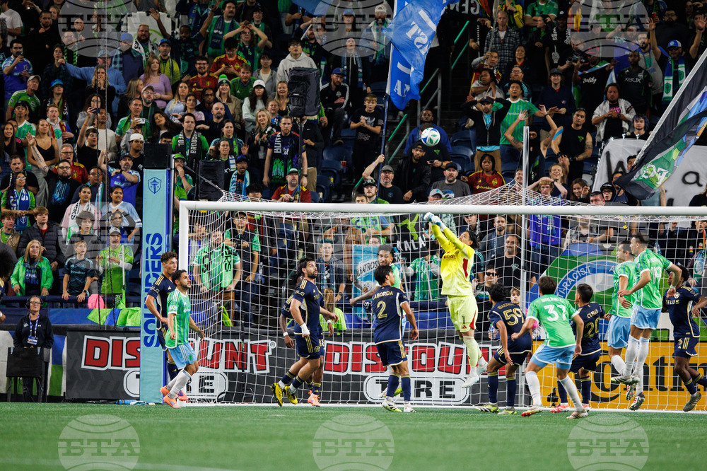 Seattle Sounders FC goalkeeper Stefan Frei (24) blocks a free kick on goal during the second half of an MLS soccer match against Vancouver Whitecaps FC on Saturday, Sept. 27, 2025, in Seattle. (AP Photo/Kevin Ng)