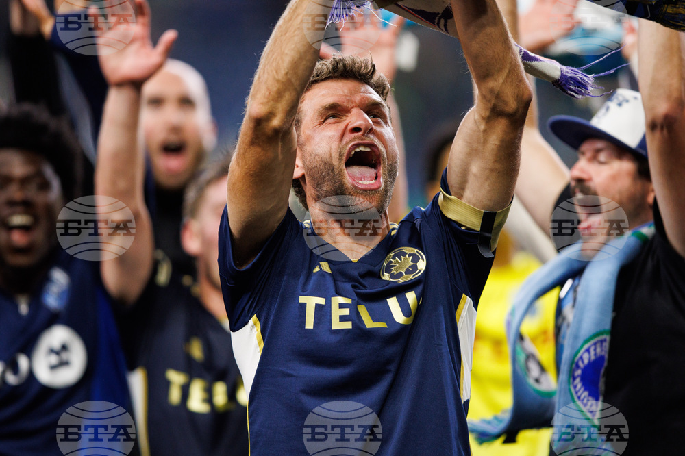Vancouver Whitecaps FC midfielder Thomas Müller celebrates a goal by forward Brian White, not pictured, during the second half of an MLS soccer match Saturday, Sept. 27, 2025, in Seattle. (AP Photo/Kevin Ng)