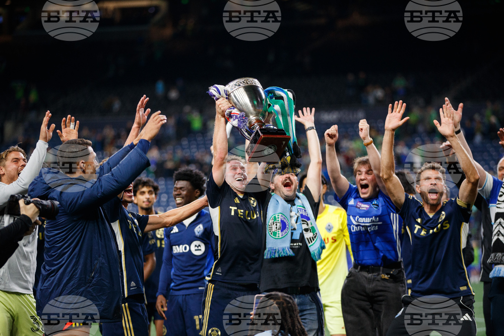 Vancouver Whitecaps FC defender Tate Johnson celebrates securing a record-eighth Cascadia Cup title after an MLS soccer match against Seattle Sounders FC on Saturday, Sept. 27, 2025, in Seattle. (AP Photo/Kevin Ng)