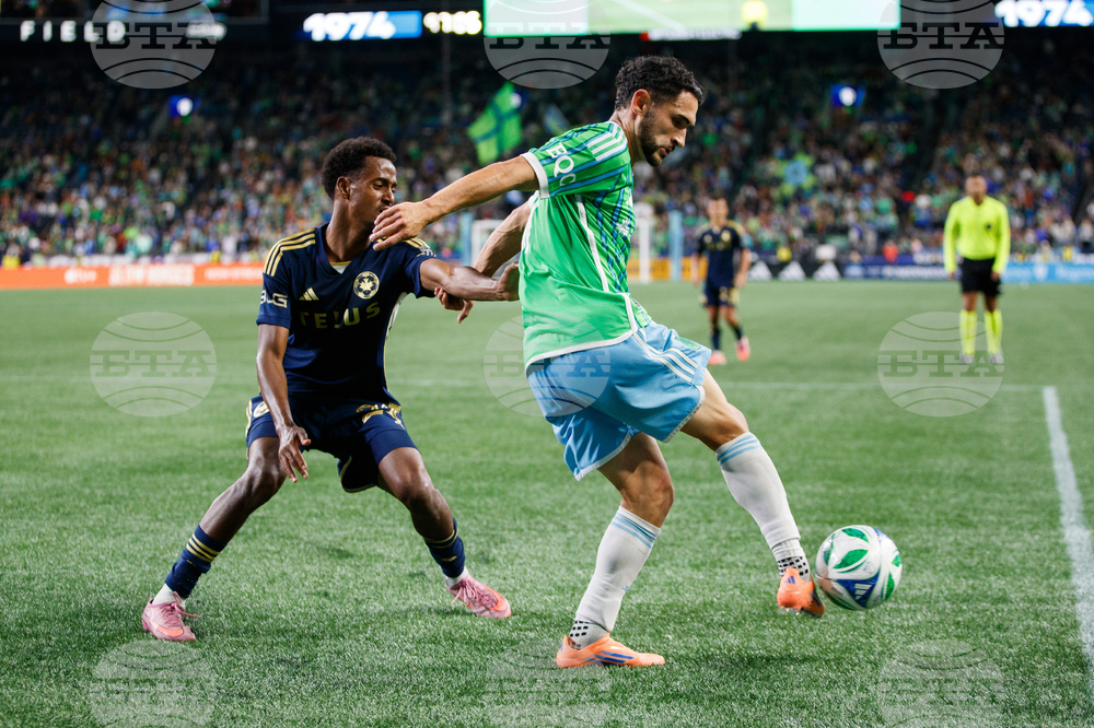Seattle Sounders FC forward Jordan Morris attempts to drive the ball past Vancouver Whitecaps FC midfielder Ralph Priso during the first half of an MLS soccer match Saturday, Sept. 27, 2025, in Seattle. (AP Photo/Kevin Ng)