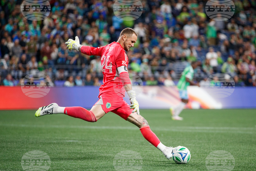 Seattle Sounders FC goalkeeper Stefan Frei (24) kicks the ball during the second half of an MLS soccer match against Vancouver Whitecaps FC on Saturday, Sept. 27, 2025, in Seattle. (AP Photo/Kevin Ng)