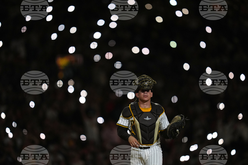 San Diego Padres catcher Freddy Fermin walks out to the mound before the ninth inning of a baseball game against the Arizona Diamondbacks Saturday, Sept. 27, 2025, in San Diego. (AP Photo/Gregory Bull)