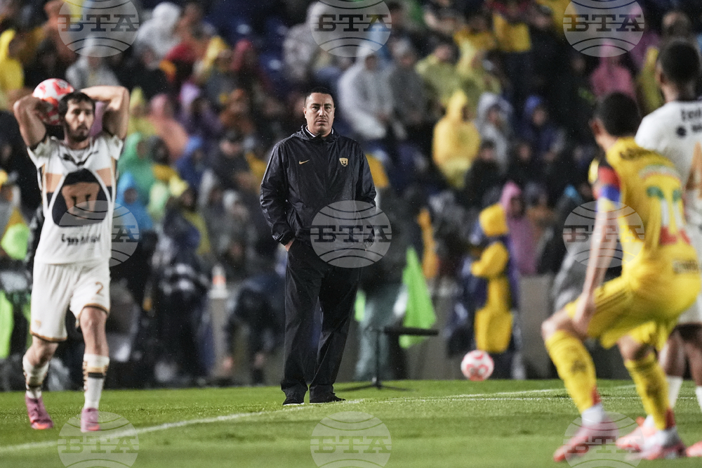Pumas' coach Efrain Juarez, center, watches from the sideline during a Mexican soccer league match against America in Mexico City, Saturday, Sept. 27, 2025. (AP Photo/Eduardo Verdugo)