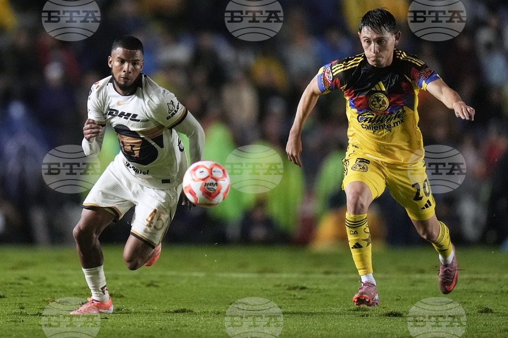 Pumas' Pablo Bennevendo, left, and America's Alexis Gutierrez vie for the ball during a Mexican soccer league match in Mexico City, Saturday, Sept. 27, 2025. (AP Photo/Eduardo Verdugo)