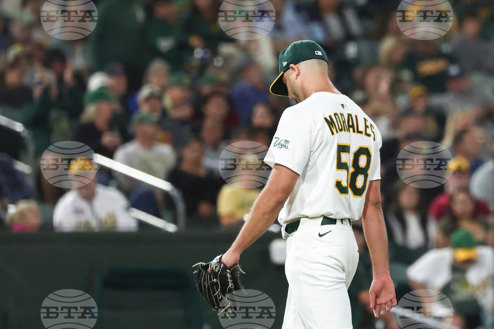 Athletics pitcher Luis Morales walks to the dugout after being relieved during the fifth inning of a baseball game against the Kansas City Royals Saturday, Sept. 27, 2025, in West Sacramento, Calif. (AP Photo/Sara Nevis)