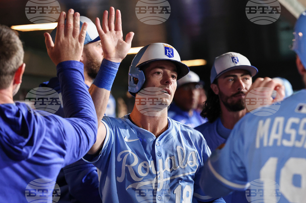 Kansas City Royals' Mike Yastrzemski, center, celebrates in the dugout after scoring during the fifth inning of a baseball game against the Athletics Saturday, Sept. 27, 2025, in West Sacramento, Calif. (AP Photo/Sara Nevis)