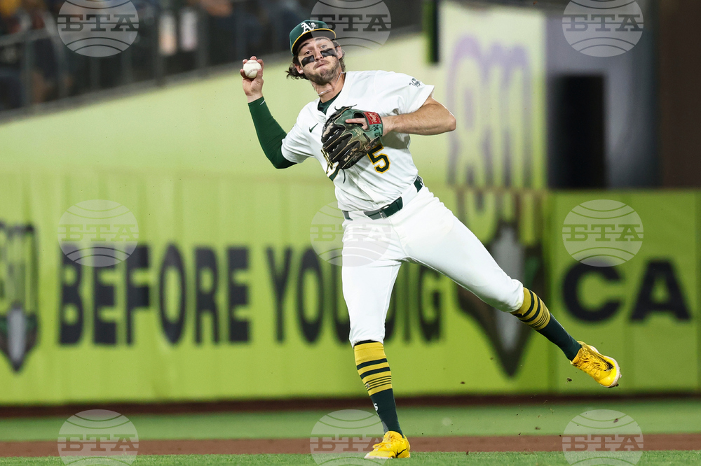 Athletics shortstop Jacob Wilson throws to first base to get Kansas City Royals' Bobby Witt Jr., not shown, out during the seventh inning of a baseball game Saturday, Sept. 27, 2025, in West Sacramento, Calif. (AP Photo/Sara Nevis)