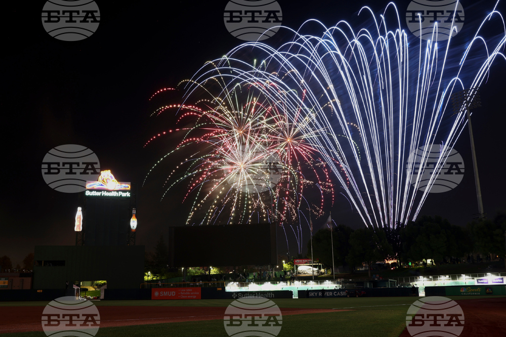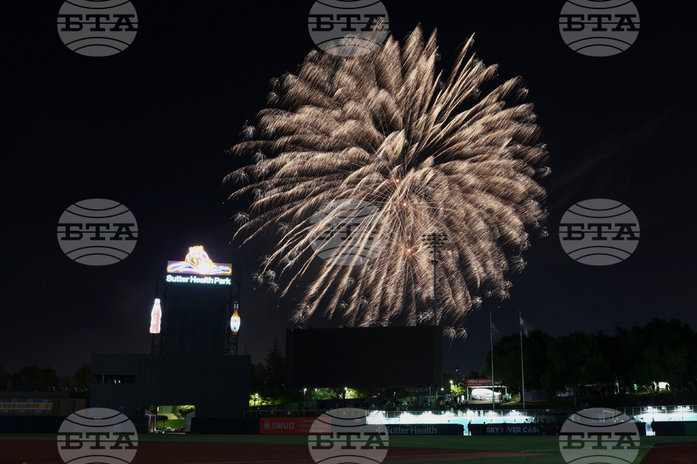 Fans watch the last fireworks show of the season after a baseball game between the Athletics and the Kansas City Royals Saturday, Sept. 27, 2025, in West Sacramento, Calif. (AP Photo/Sara Nevis)