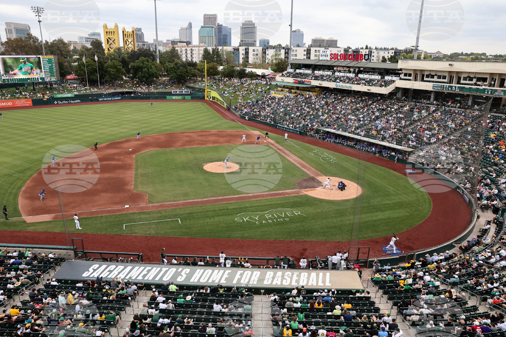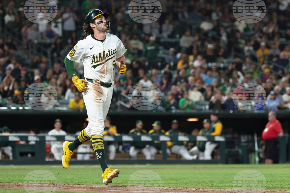 Athletics' Darell Hernaiz scores on a double hit by Carlos Cortes, not shown, during the seventh inning of a baseball game against the Kansas City Royals Saturday, Sept. 27, 2025, in West Sacramento, Calif. (AP Photo/Sara Nevis)