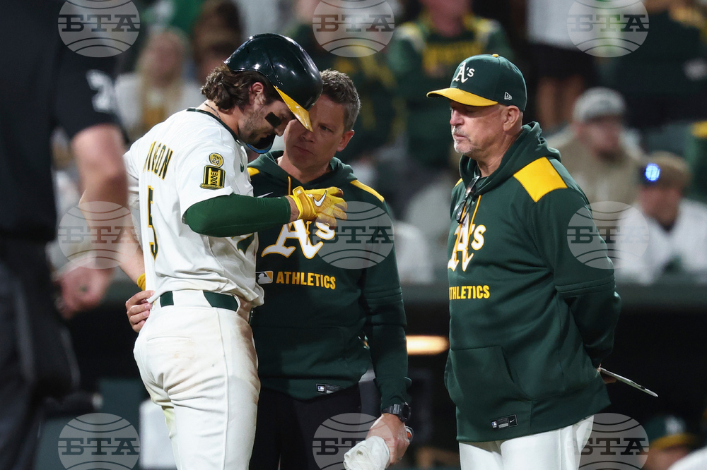 Athletics' Jacob Wilson, left, gets checked by Assistant Athletic Trainer Nate Brooks, center, and manager Mark Kotsay, right, after getting hit by a pitch from Kansas City Royals pitcher Carlos Estévez, not shown, during the ninth inning of a baseball game Saturday, Sept. 27, 2025, in West Sacramento, Calif. (AP Photo/Sara Nevis)