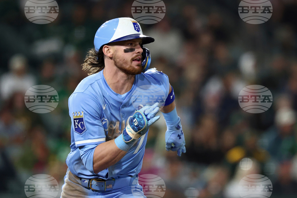 Kansas City Royals Bobby Witt Jr. runs after hitting a single during the ninth inning of a baseball game against the Athletics Saturday, Sept. 27, 2025, in West Sacramento, Calif. (AP Photo/Sara Nevis)