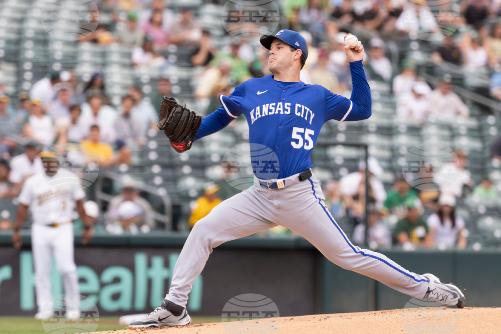 Kansas City Royals pitcher Cole Ragans throws to the Athletics during the first inning of a baseball game Sunday, Sept. 28, 2025, in West Sacramento, Calif. (AP Photo/Sara Nevis)