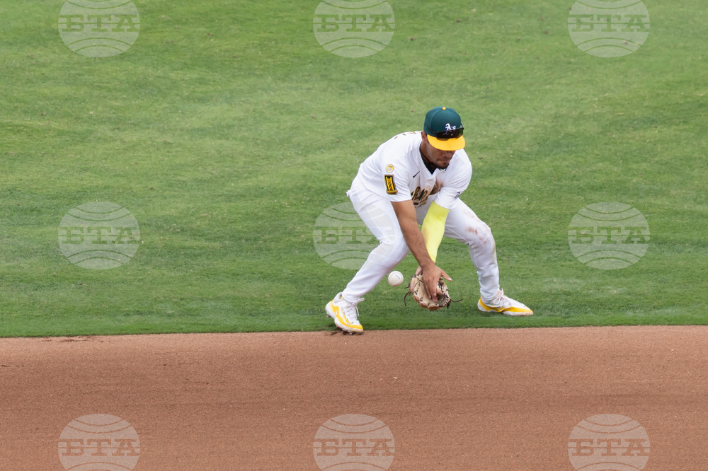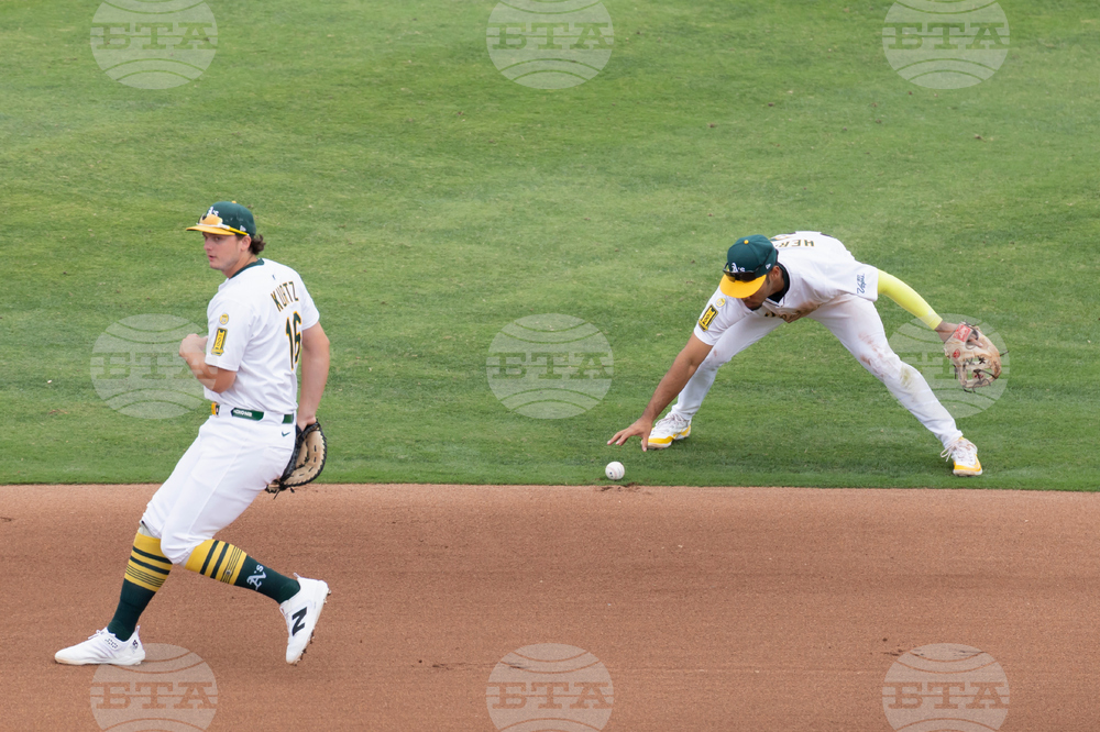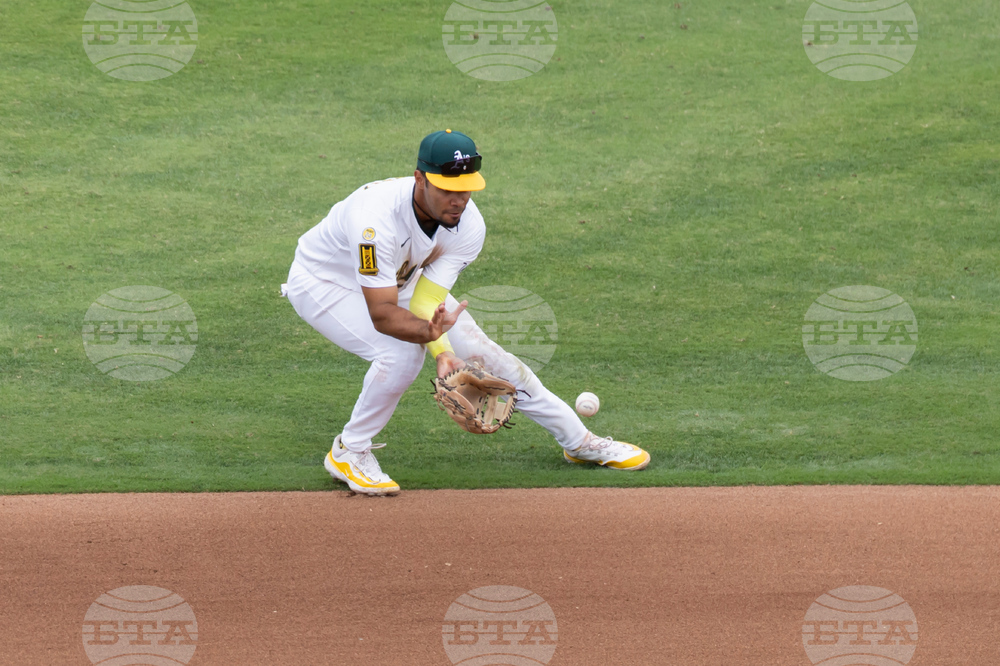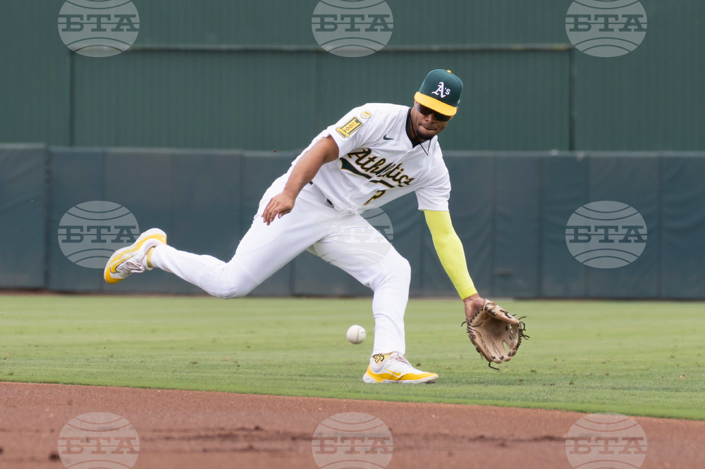 Athletics second baseman Darell Hernaiz attempts to field the ball during the seventh inning of a baseball game against the Kansas City Royals, Sunday, Sept. 28, 2025, in West Sacramento, Calif. (AP Photo/Sara Nevis)