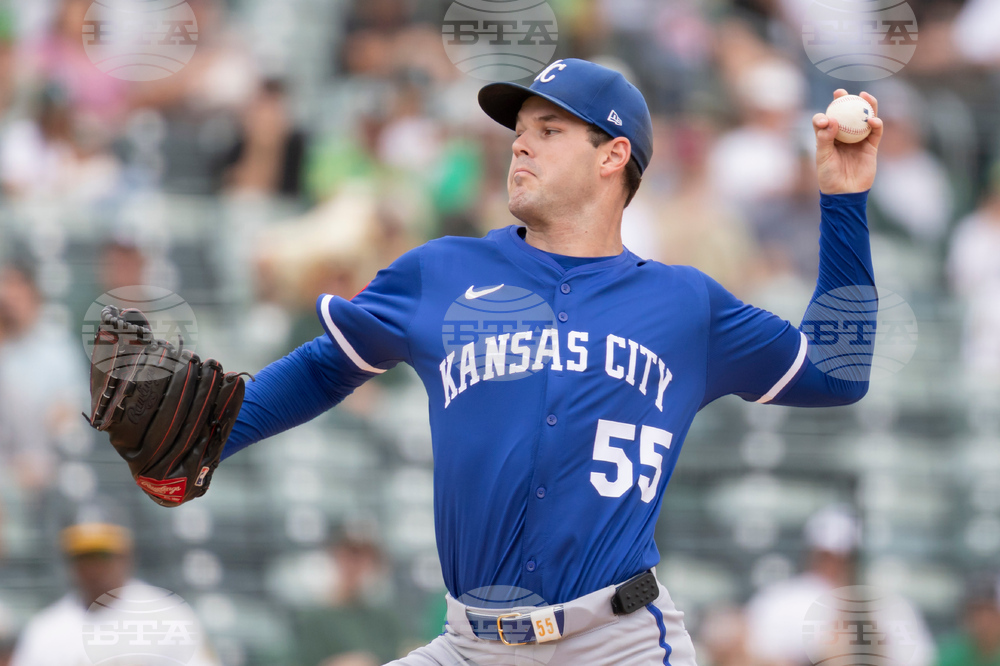 Kansas City Royals pitcher Cole Ragans, center, throws to the Athletics during the fifth inning of a baseball game Sunday, Sept. 28, 2025, in West Sacramento, Calif. (AP Photo/Sara Nevis)
