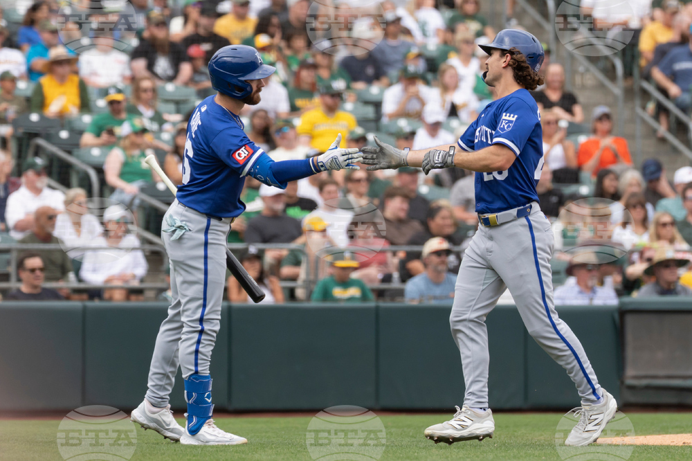 Kansas City Royals' Adam Frazier, right, celebrates with John Rave, left, after scoring during the fourth inning of a baseball game against the Athletics Sunday, Sept. 28, 2025, in West Sacramento, Calif. (AP Photo/Sara Nevis)