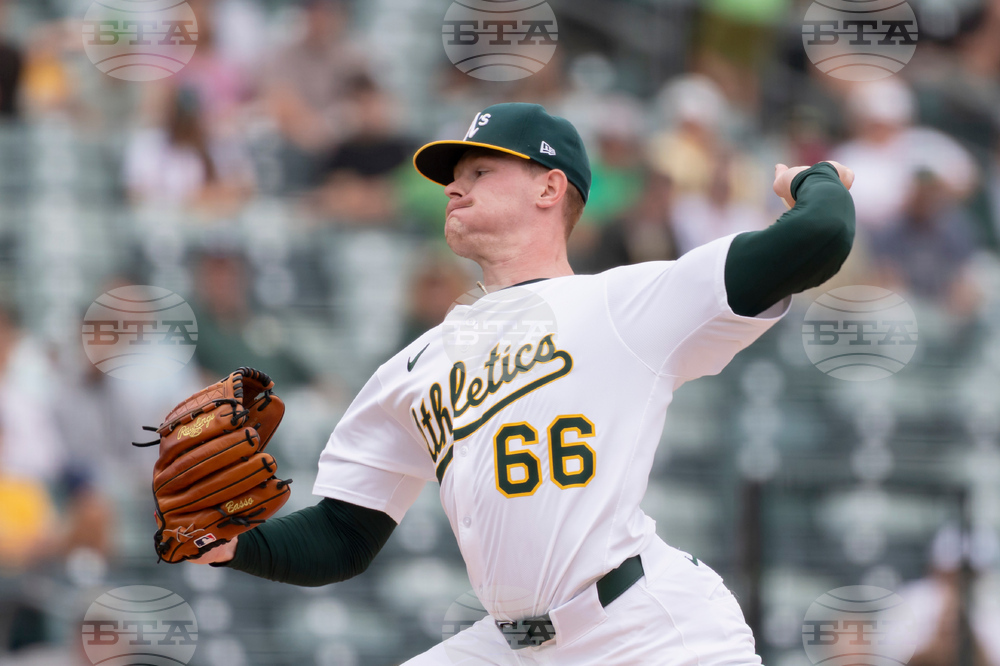 Athletics pitcher Brady Basso throws to the Kansas City Royals during the first inning of a baseball game Sunday, Sept. 28, 2025, in West Sacramento, Calif. (AP Photo/Sara Nevis)