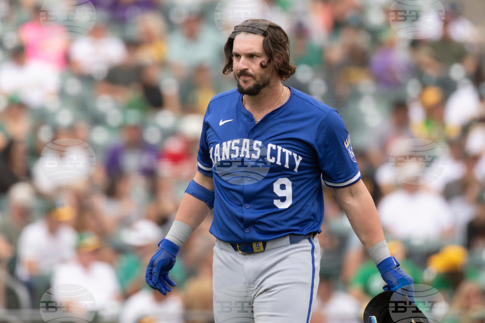 Kansas City Royals outfielder Adam Frazier leaves the dugout after a baseball game against the Athletics Sunday, Sept. 28, 2025, in West Sacramento, Calif. (AP Photo/Sara Nevis)