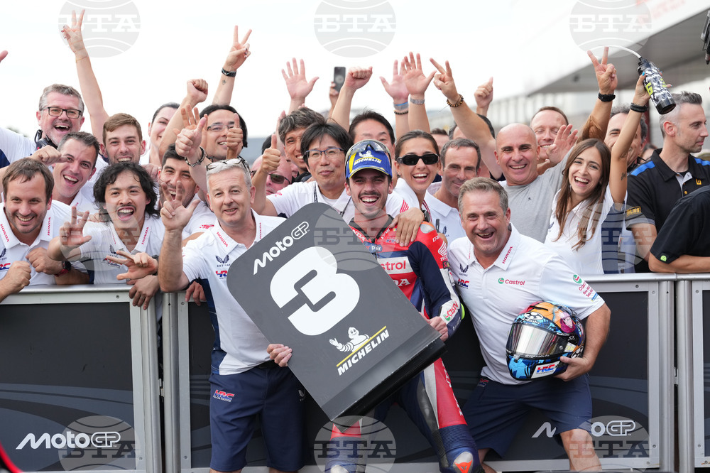 Spanish rider Joan Mir of Honda HRC Castrol, center, celebrates with his team after taking third place after the MotoGP class race of the MotoGP Japanese Grand Prix at the Motegi circuit in Motegi, north of Tokyo, Sunday, Sept. 28, 2025. (AP Photo/Hiro Komae)