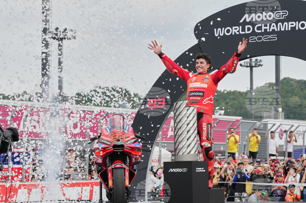 Spanish rider Marc Marquez of Ducati Lenovo Team celebrate with his team after wins his seventh MotoGP title, and ninth world championship at the MotoGP Japanese Grand Prix at the Motegi circuit in Motegi, north of Tokyo, Sunday, Sept. 28, 2025. (AP Photo/Hiro Komae)