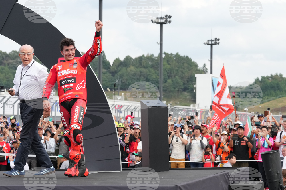 Spanish rider Marc Marquez of Ducati Lenovo Team, celebrates after crossing finishing line during the MotoGP class race of the MotoGP Japanese Grand Prix at the Motegi circuit in Motegi, north of Tokyo, Sunday, Sept. 28, 2025. (AP Photo/Hiro Komae)