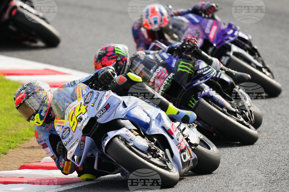 Italian rider Fabio Di Giannantonio of Pertamina Enduro VR46 Racing Team, left, takes a corner during the MotoGP class race of the MotoGP Japanese Grand Prix at the Motegi circuit in Motegi, north of Tokyo, Sunday, Sept. 28, 2025. (AP Photo/Hiro Komae)
