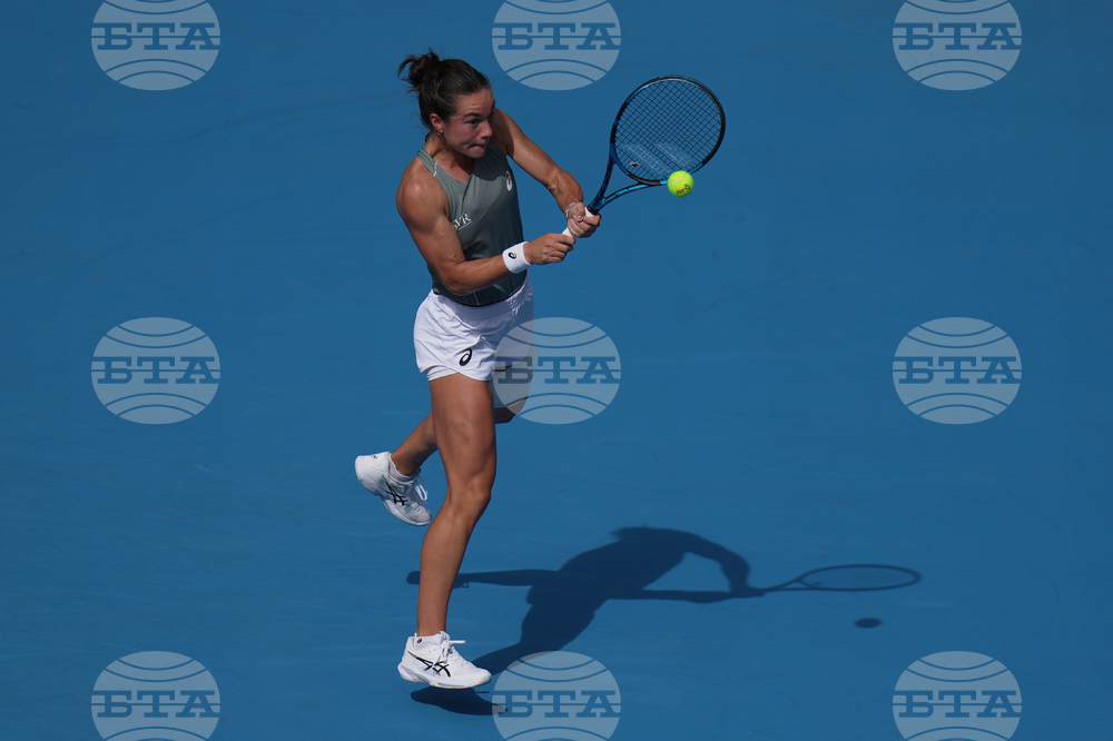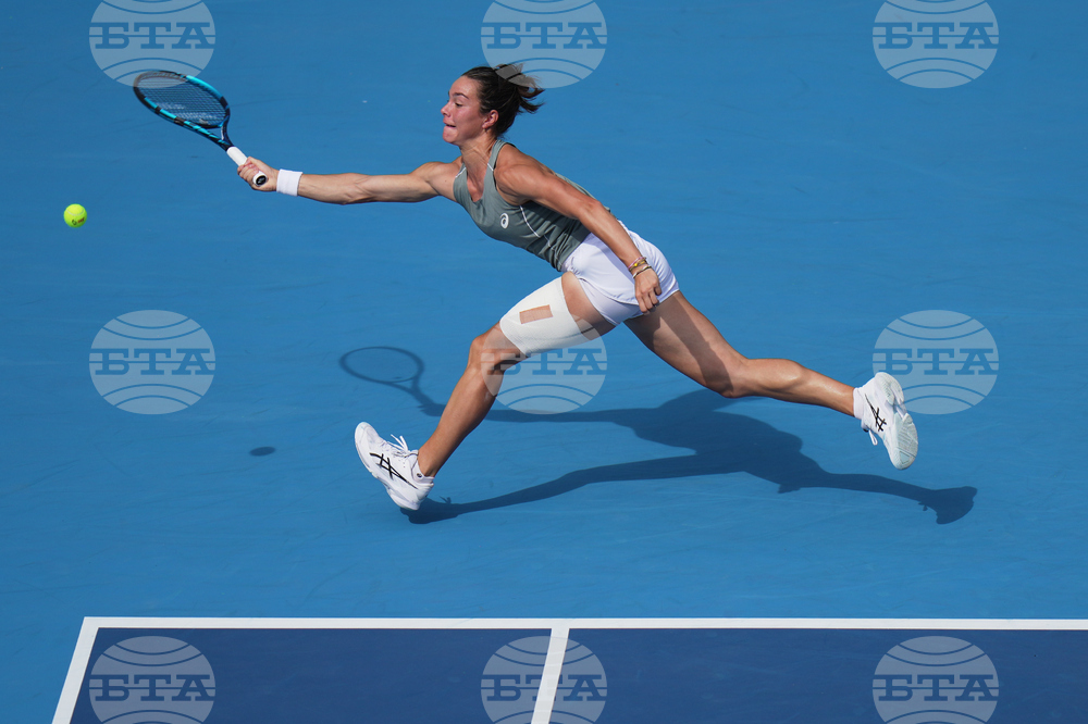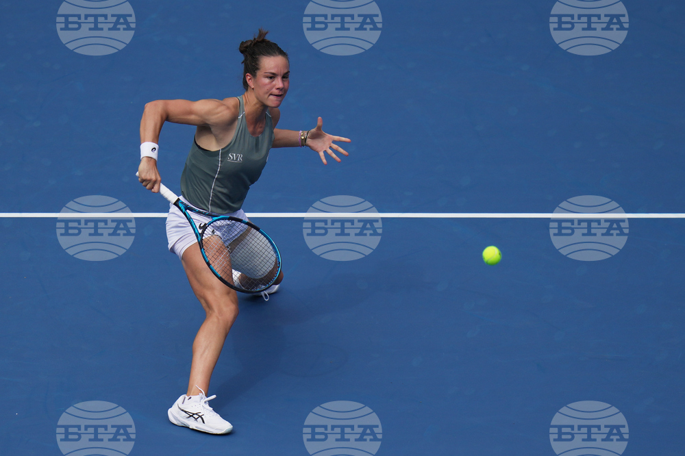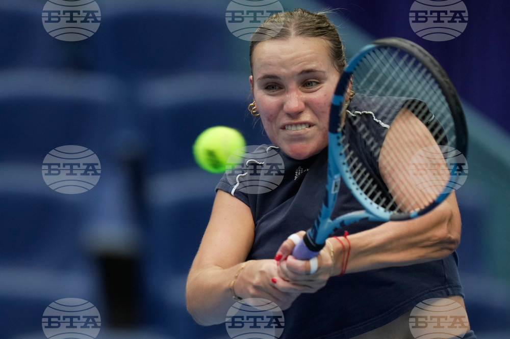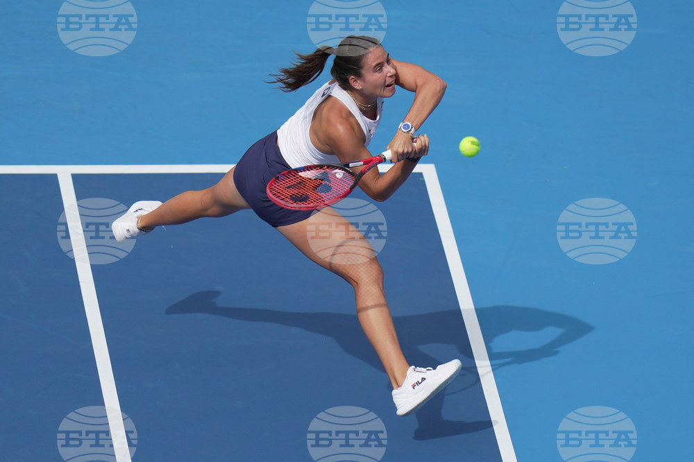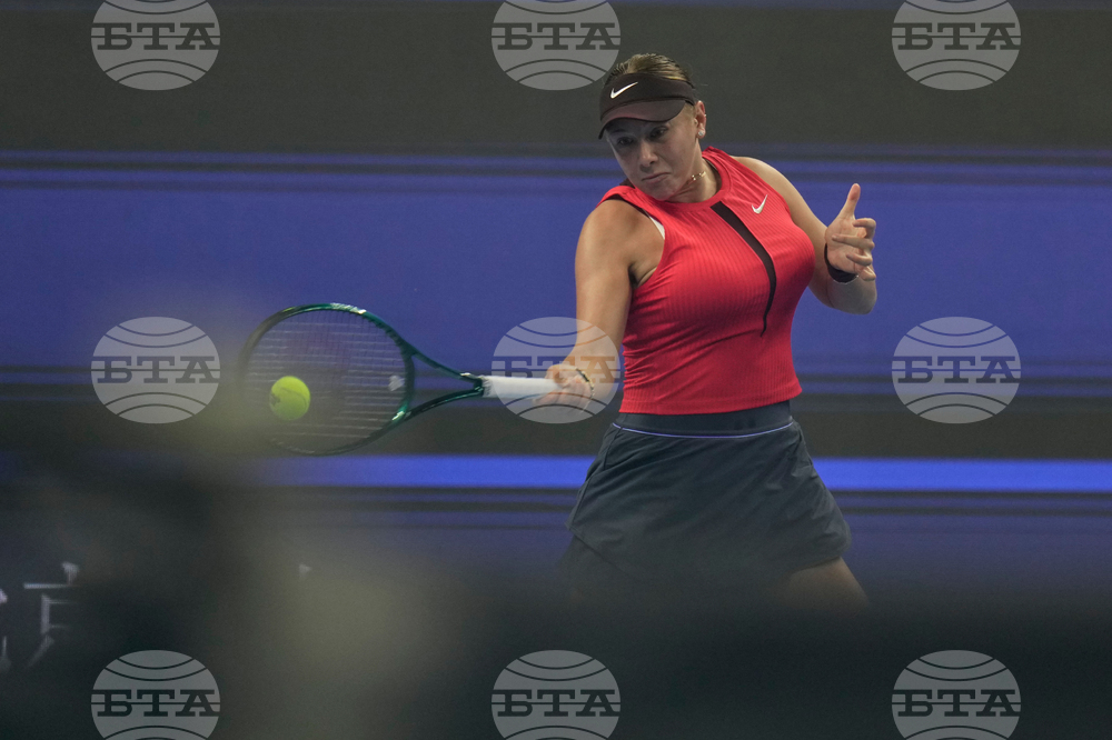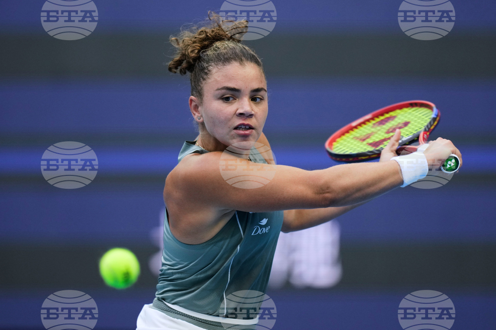 Sofia Kenin of the United States plays a backhand return to Jasmine Paolini of Italy during a women's singles match of the China Open tennis tournament, at the National Tennis Center, in Beijing, China, Sunday, Sept. 28, 2025. (AP Photo/Mahesh Kumar A.)