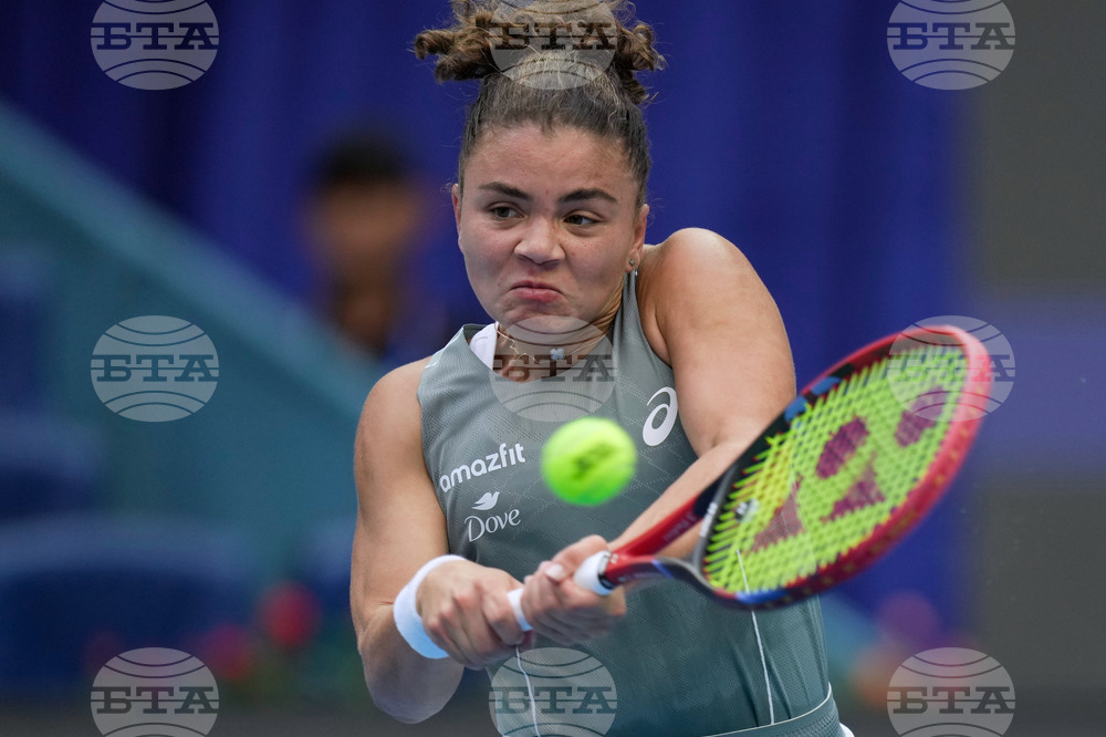 Jasmine Paolini of Italy plays a backhand return to Sofia Kenin of the United States during a women's singles match of the China Open tennis tournament, at the National Tennis Center, in Beijing, China, Sunday, Sept. 28, 2025. (AP Photo/Mahesh Kumar A.)