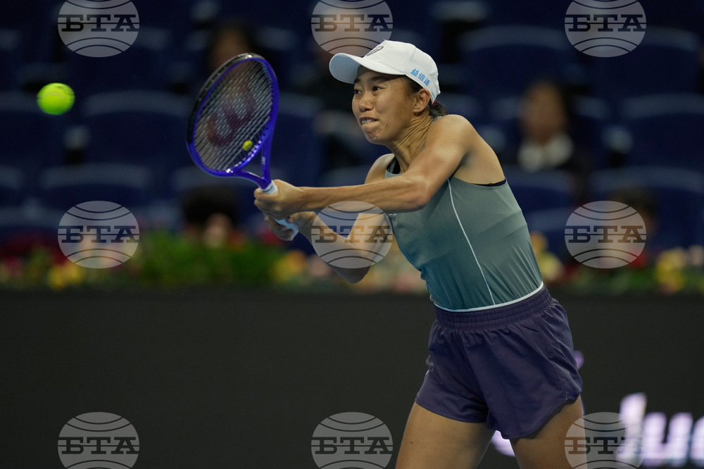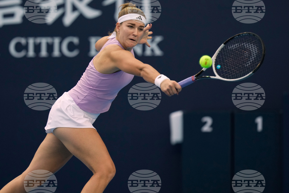 Shuai Zhang of China plays a backhand return to Amanda Anisimova of the United States during a women's singles match of the China Open tennis tournament, at the National Tennis Center, in Beijing, China, Sunday, Sept. 28, 2025. (AP Photo/Mahesh Kumar A.)