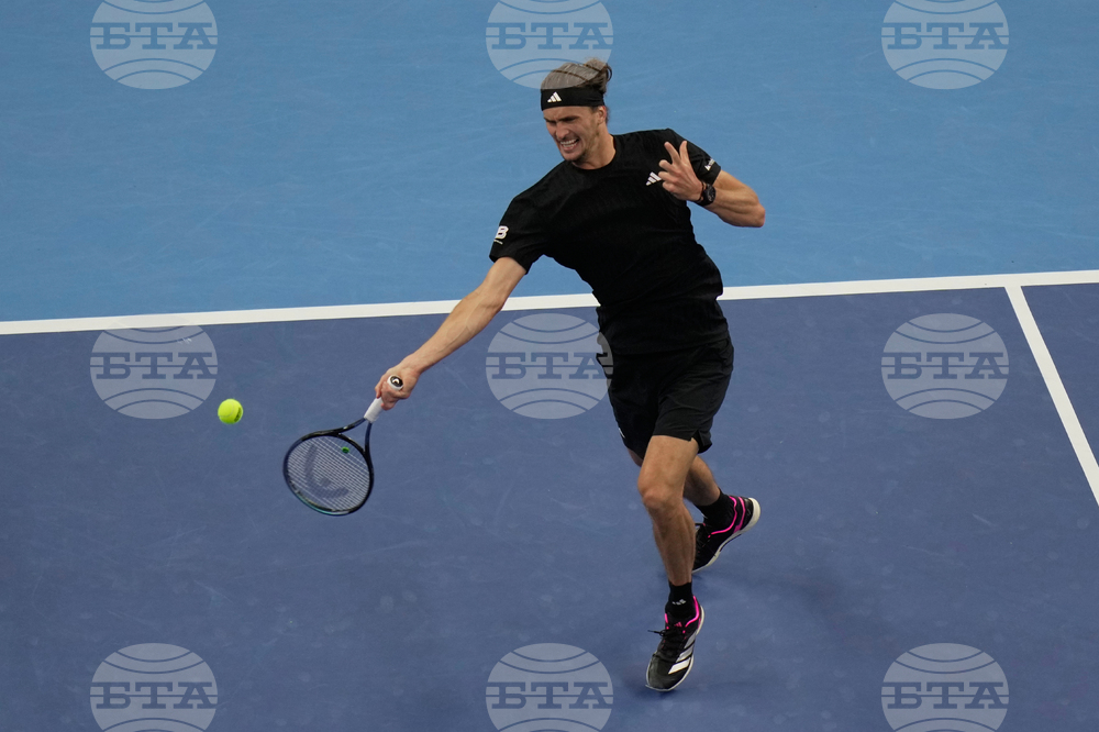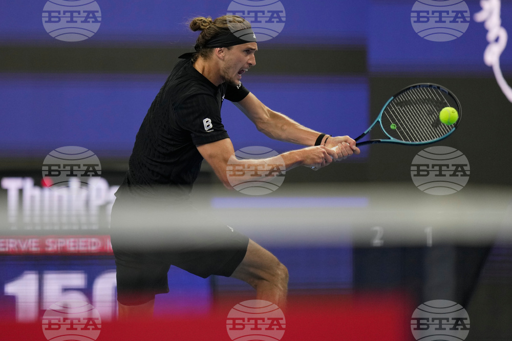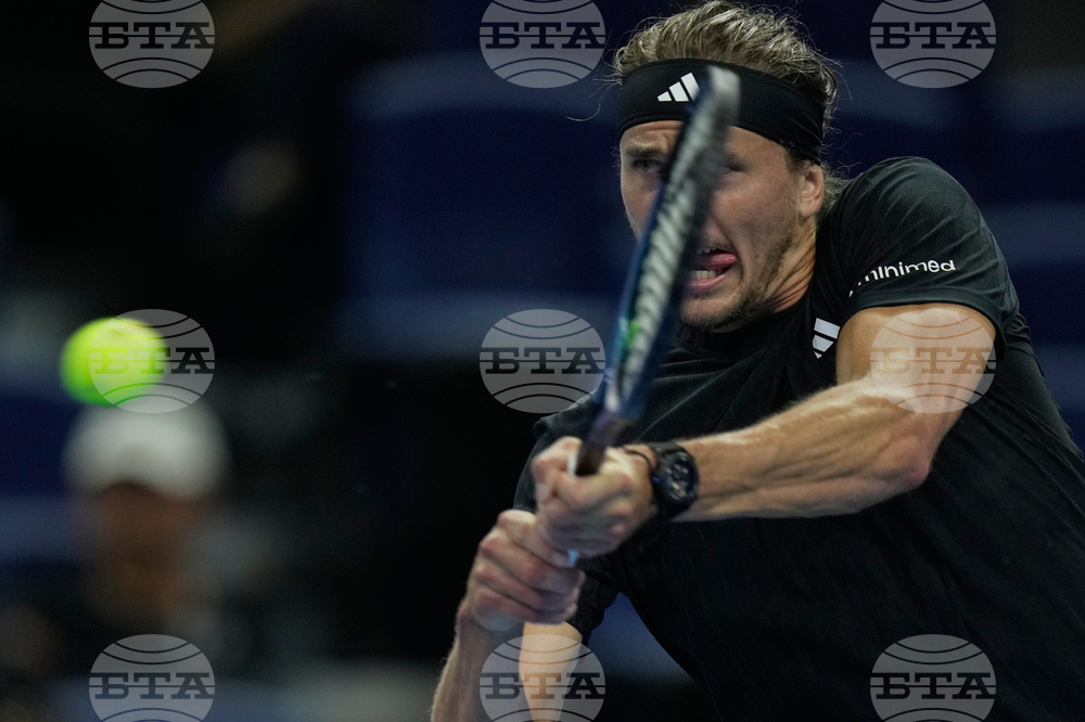 Alexander Zverev of Germany plays a backhand return to Corentin Moutet of France during the men's singles match of the China Open tennis tournament, at the National Tennis Center, in Beijing, China, Sunday, Sept. 28, 2025. (AP Photo/Mahesh Kumar A.)