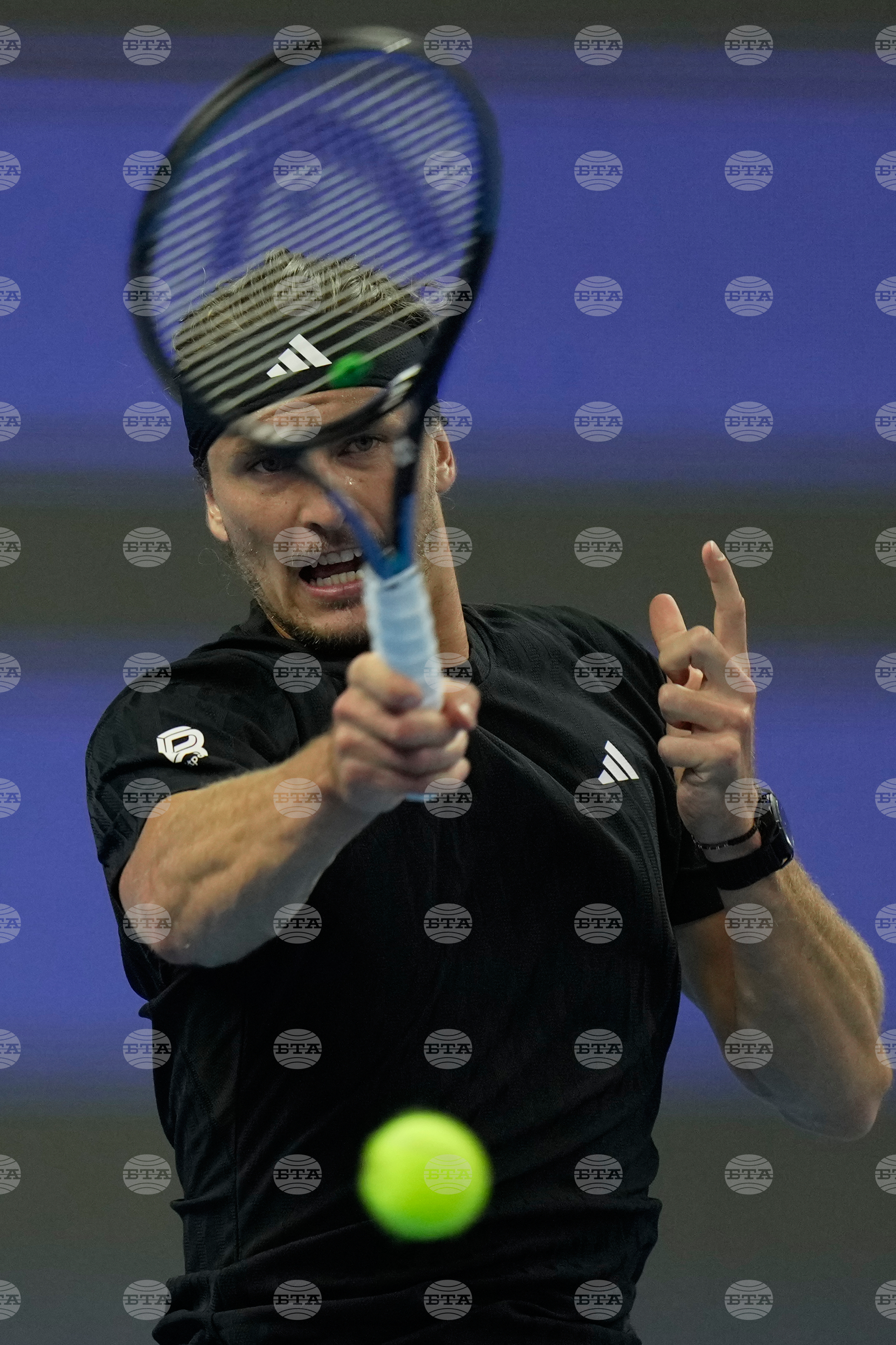 Alexander Zverev of Germany plays forehand return to Corentin Moutet of France during the men's singles match of the China Open tennis tournament, at the National Tennis Center, in Beijing, China, Sunday, Sept. 28, 2025. (AP Photo/Mahesh Kumar A.)