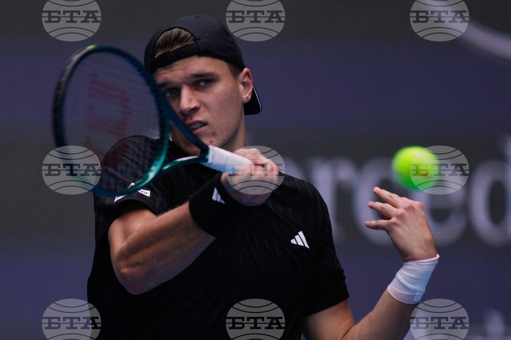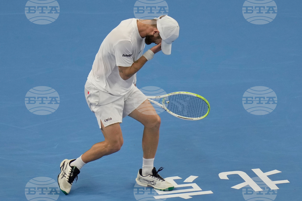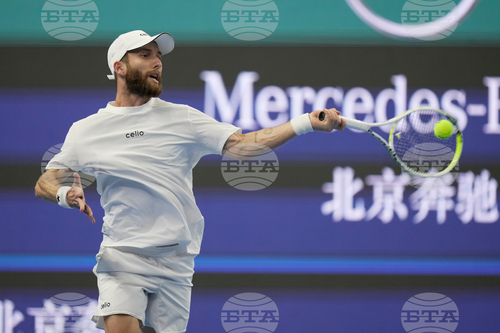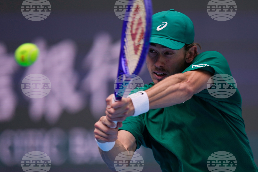 Alex De Minaur, of Australia returns a backhand shot to Jakub Mensik of the Czech Republic during a men's singles match of the China Open tennis tournament, at the National Tennis Center, in Beijing, China, Monday, Sept. 29, 2025. (AP Photo/Mahesh Kumar A.)