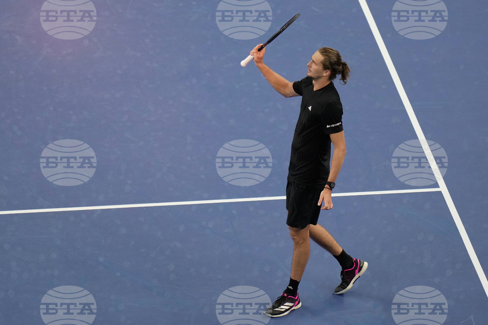 Alexander Zverev of Germany celebrates after defeating Corentin Moutet of France in the men's singles match for the China Open tennis tournament, at the National Tennis Center, in Beijing, China, Sunday, Sept. 28, 2025. (AP Photo/Mahesh Kumar A.)
