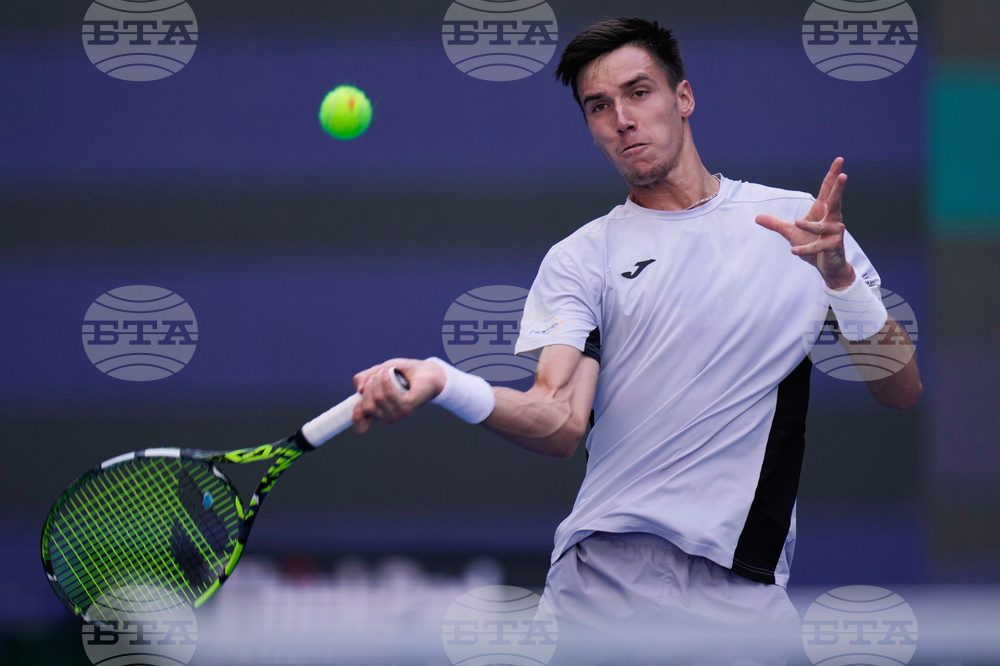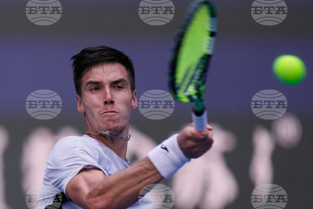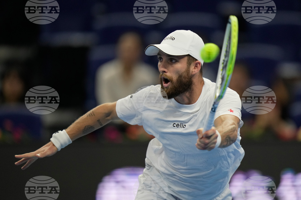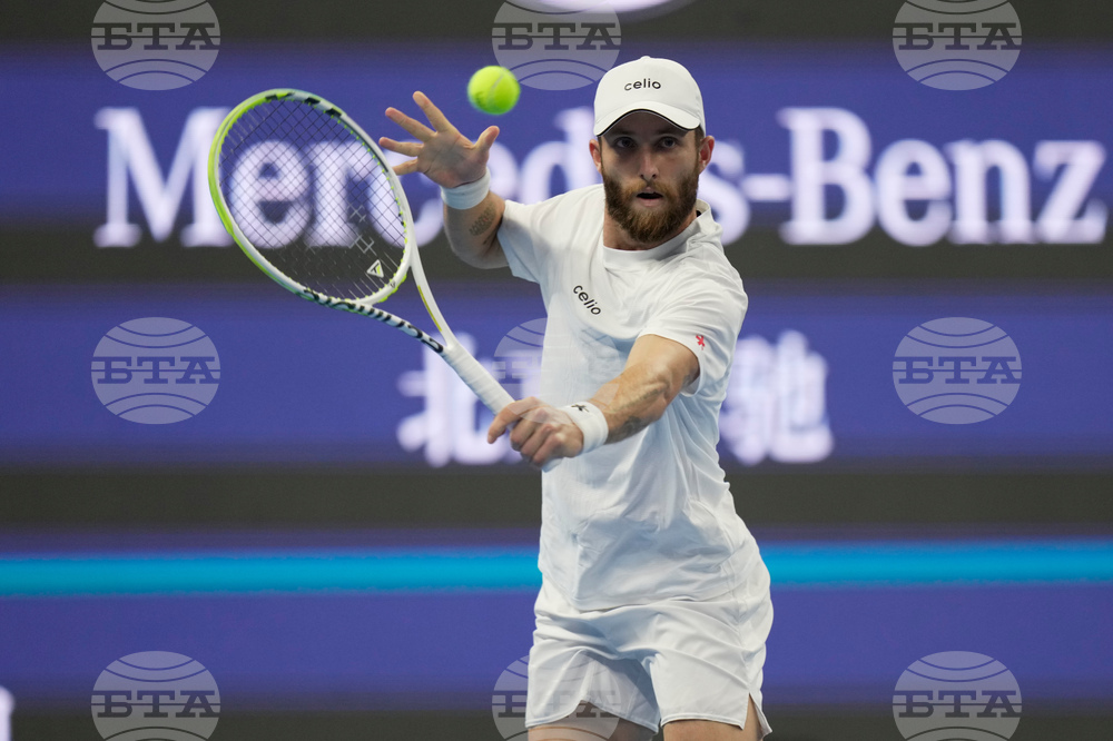 Fabian Marozsan, of Hungary returns a backhand shot to Jannik Sinner, of Italy during a men's singles match of the China Open tennis tournament, at the National Tennis Center, in Beijing, China, Monday, Sept. 29, 2025. (AP Photo/Mahesh Kumar A.)